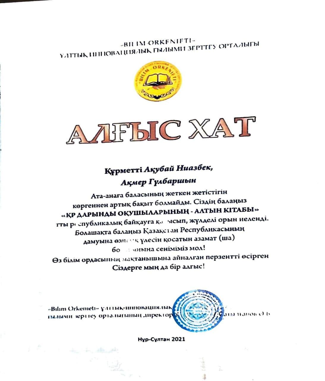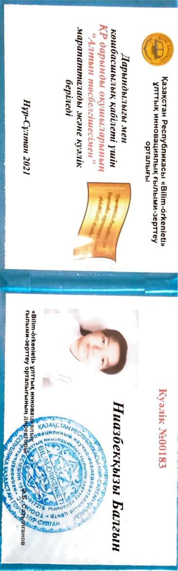 Қазақстан Республикасы Тәуелсіздігінің 30 жылдық мерейтойына орай Президент Қасым-Жомарт Кемелұлы Тоқаевтың "Тәуелсіздік бәрінен қымбат" атты бағдарламалық мақаласын білім алушылар арасында кеңінен насихаттау мақсатында өткен "ҚР ДАРЫНДЫ ОҚУШЫЛАРЫНЫҢ- АЛТЫН КІТАБЫ"атты Республикалық байқауына қатысып 1-дәрежелі дипломмен және арнайы төсбелгімен Ниазбекқызы Балғын марапатталды. Ата-анасы және жетекшісі Тоқтыбаева Жадыра алғыс хаттарымен марапатталды. Балғынға толағай табыстар мен жетістіктер тілейміз, қанатың талмасын!!!