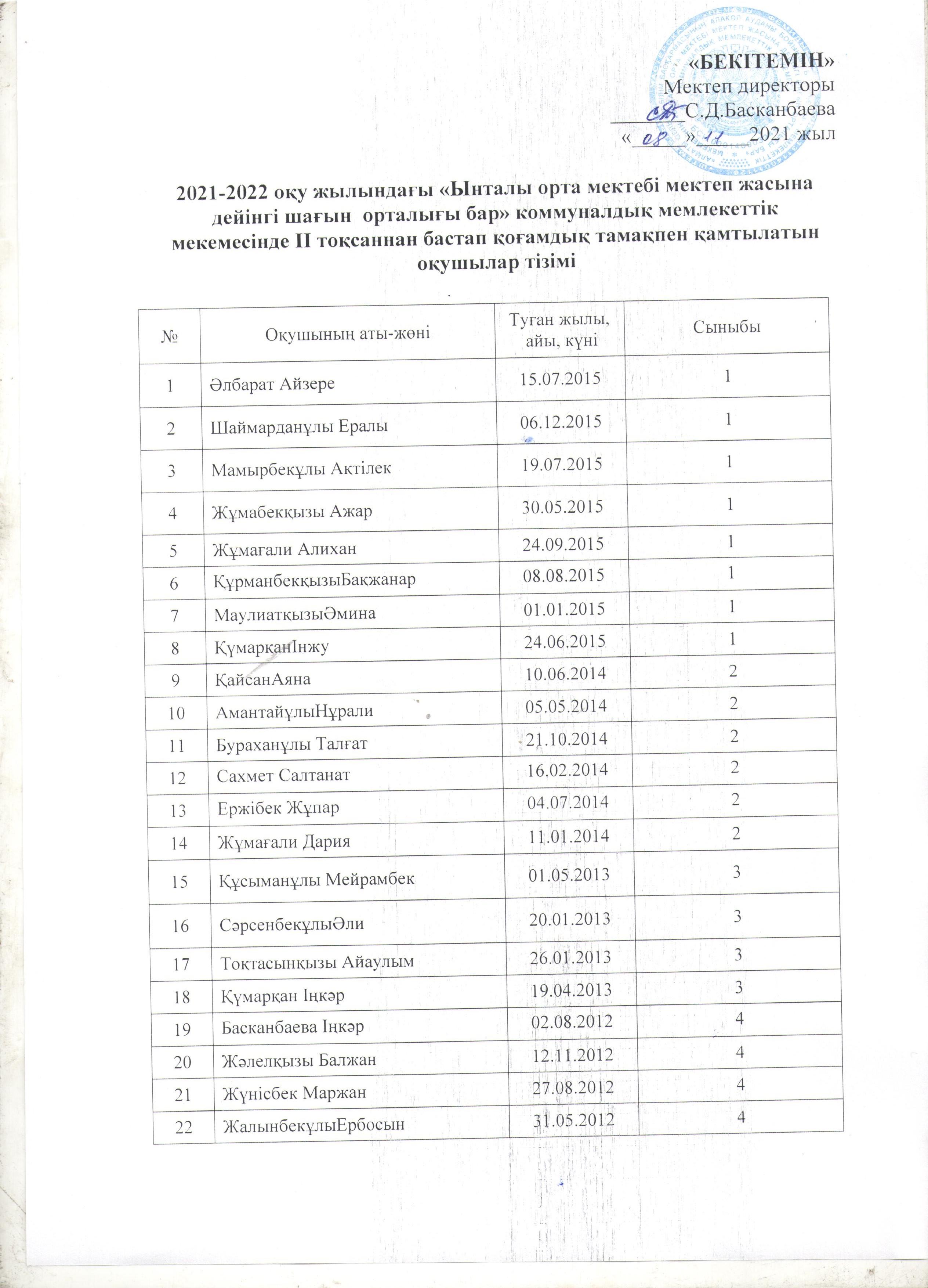 2 тоқсаннан бастап қоғамдық тамақпен қамтылатын оқушылар тізімі » Ынталы орта мектебі
