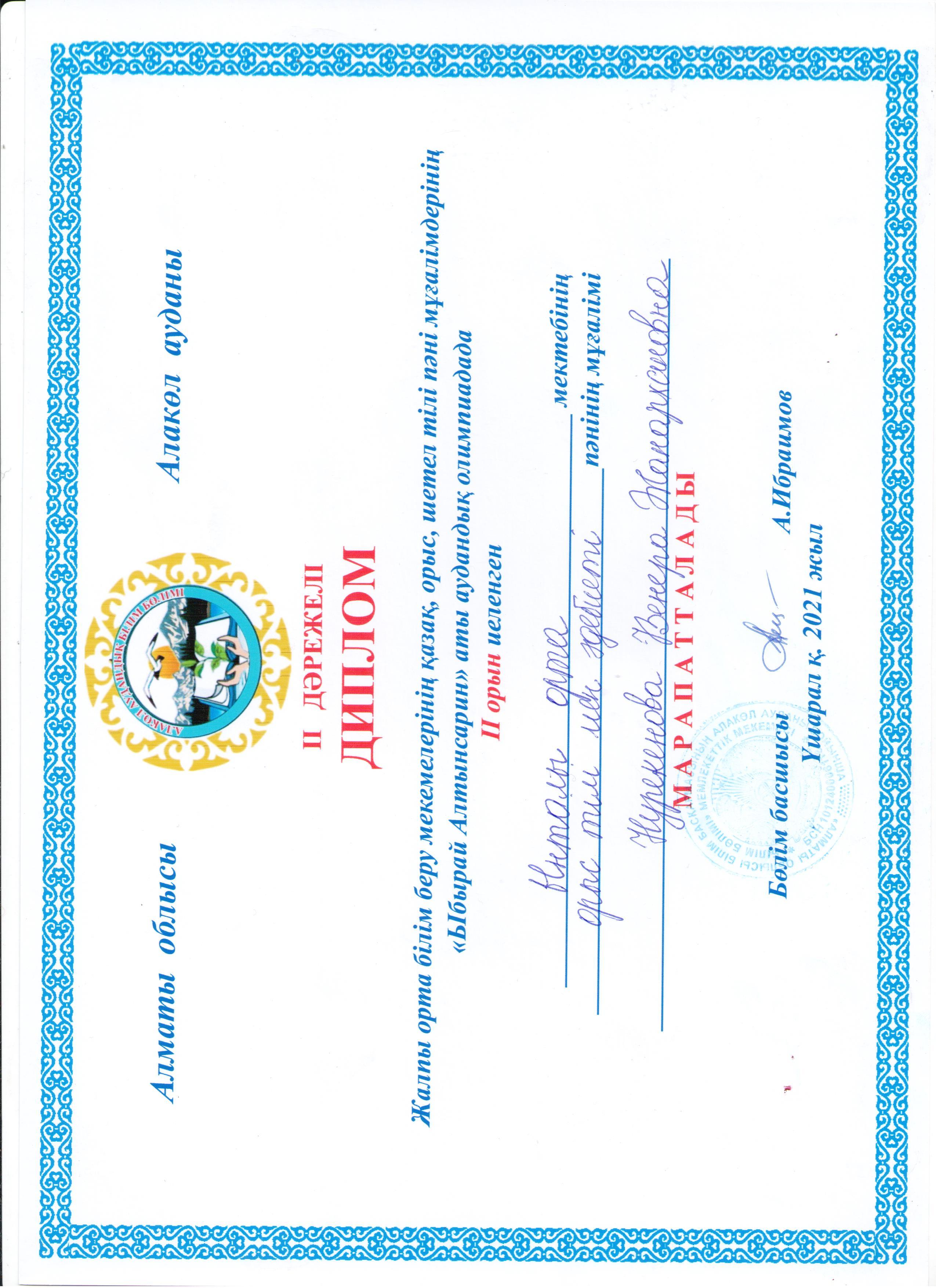 25 октябрь 2021 0 Жарайсыз! Аудандық ұстаздар арасында өткен «Ыбрай Алтынсарин» атындағы пән олимпиадасының жүлделі 2-орын иегері мектебіміздің орыс тілі мен әдебиеті пәні мұғалімі Нурекенова Венера Жанархановнаны құттықтаймыз!