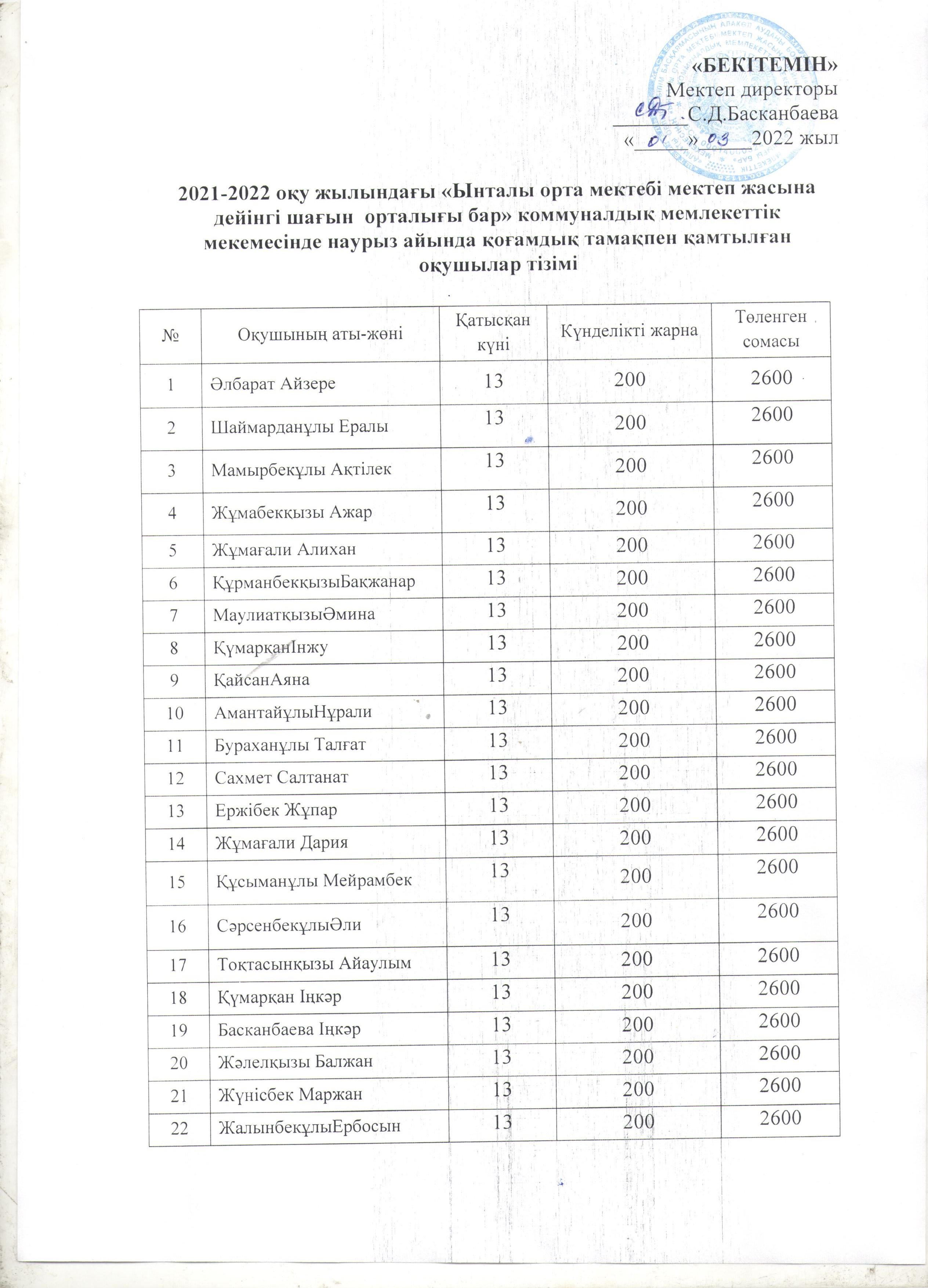 Қоғамдық тамақпен қамтылған оқушылар саны » Ынталы орта мектебі
