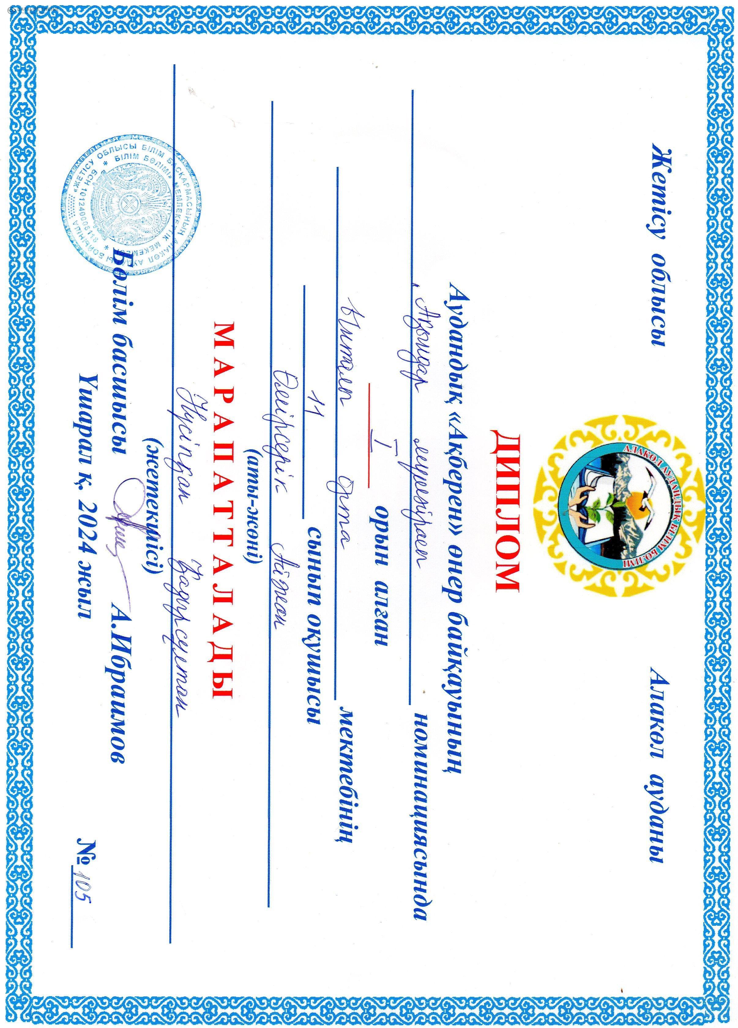 24 октябрь 2024 0 Аудандық "Ақберен" өнер байқауының Ақындар мүшәйрасы номинациясында 1 орын алған 11 сынып оқушысы Өмірсерік Айжан