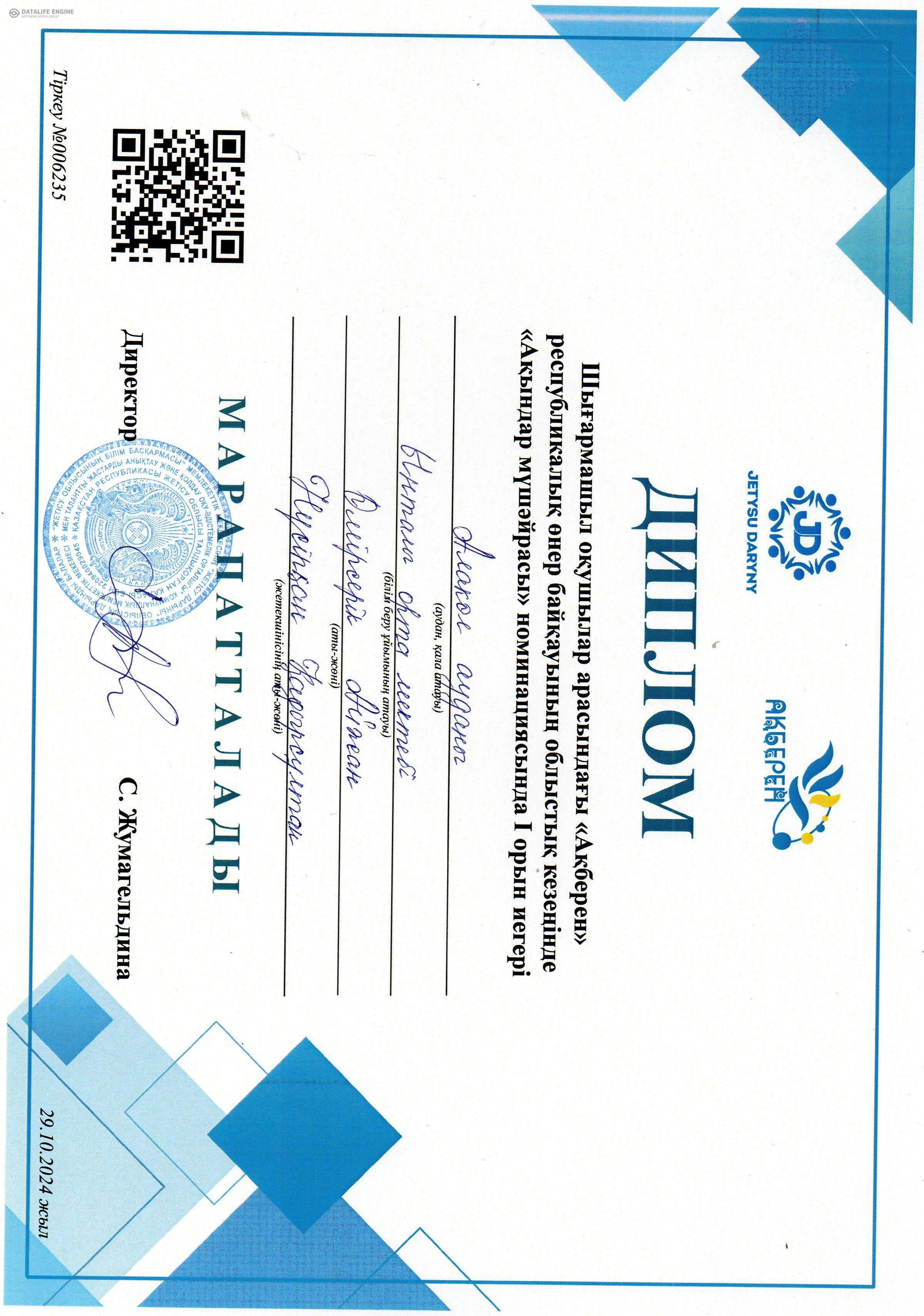 Шығармашыл оқушылар арасындағы "Ақберен" республикалық өнер байқауының облыстық кезеңінде "Ақындар мүшәйрасы" номинациясында 1 орын иегері Омірсерік Айжан жетекшісі Нүсіпқан Қадірсұлтан