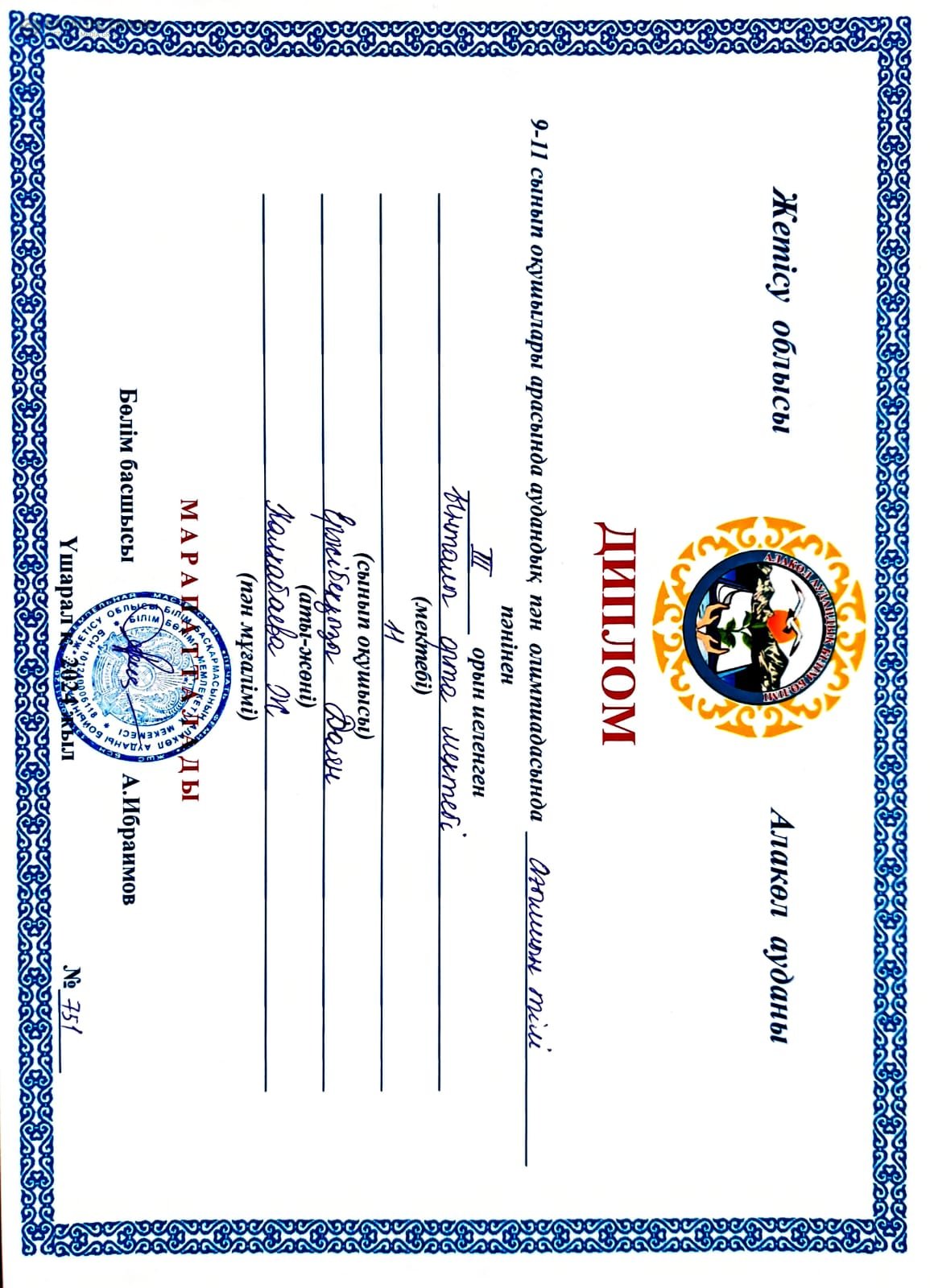 Ынталы орта мектебі » Ақпарат » 9-11 сынып оқушылары арасында аудандық пән олимпиадасында ағылшан тілі пәнінен 3 орын иеленген Ержібекқызы Баян жетекшісі Калкабаева Жанар